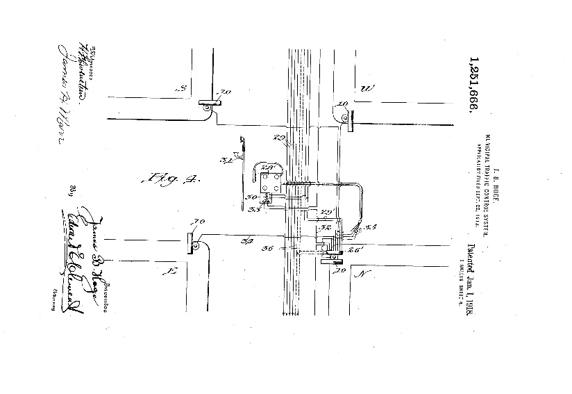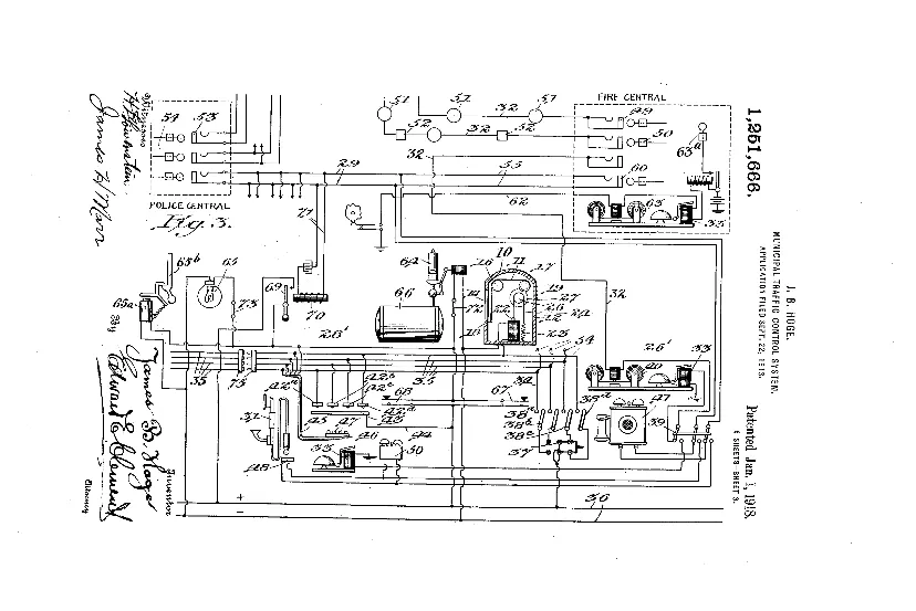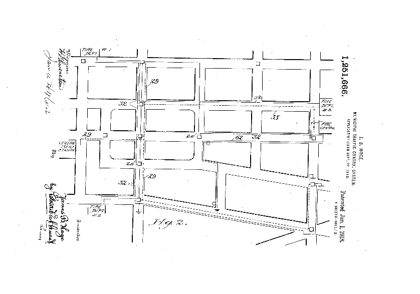 “城市商业区的平面图,显示消防和警察中央站以及多个交通控制站和消防、警察电报和电话连接。”美国专利商标局