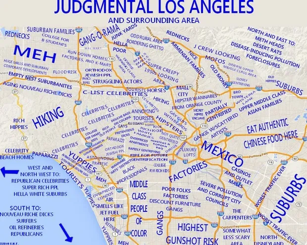 可能冒犯,但令人震惊地准确。RBD 企业在曼哈顿,“超级白人”住在哪里?在北弗吉尼亚,“没有牙齿的红脖子”在哪里,以及在洛杉矶的“橙县伪潮人”又在哪里?