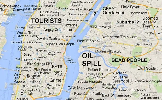 纽约是一个相对准确的 地图,并提供了这些事物如何运作的良好图景。副标题为“重要的部分”,它将东村称为“老化的朋克”,将平铁区和切尔西称为“扩展的同性恋区”,将南布朗克斯称为“可能不会在一段时间内进行城市更新”。阿斯托里亚发电站被称为“iPad的电力”,而罗斯福岛,这个东河中的神秘住宅土地,则简单地标记为“?”新泽西的居民要么会对他们被称为“便宜的天然气”和“奇怪的气味”的土地感到不满,要么感到自豪。