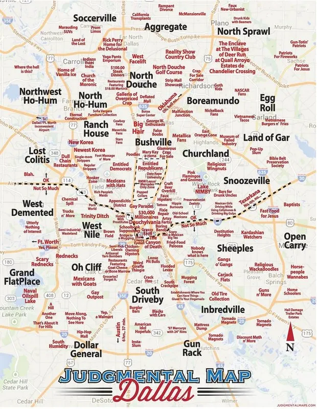 答案可能在“评判地图”中找到,也可能找不到,这是一个无畏的意见项目,似乎旨在嘲弄美国最大的城市。由奥斯汀喜剧演员 特伦特·吉拉斯皮策划,这些地图为反映制作者偏见观点的社区提供了替代名称。它们常常令人捧腹,有时几乎完全错误,而且往往光辉灿烂地粗俗。