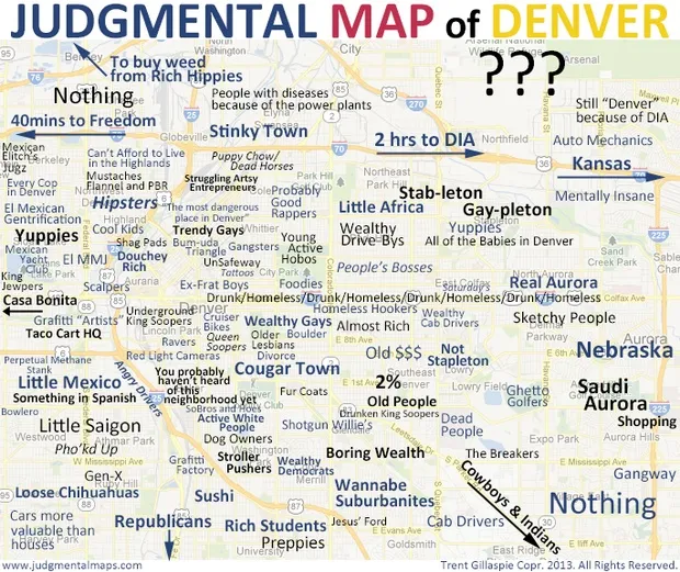彭博社城市实验室休斯顿地区火灾由SUV事故引起,官员称加利福尼亚的反超速法案可能成为交通安全的突破休斯顿附近的管道火灾迫使居民撤离伦敦市长计划将繁忙的牛津街步行化28岁的吉拉斯皮“绝对”认为自己是一个爱评判的人。“我们大多数人都是,”他在邮件中说,“无论我们是否意识到并在地图上贴上标签。”这种快速概括的性格实际上是促使这一努力开始的原因:他习惯于用刻板印象而不是名称来描述社区,这激发了 他的第一张评判地图,来自他原籍的丹佛。地图上布满了“无聊的财富”、“醉酒/无家可归/醉酒/无家可归/醉酒/无家可归”和“你可能还没听说过这个社区”等地名。他的朋友们开始制作自己的例子,所以他开设了一个博客,以容纳不断增长的无所顾忌的制图集。