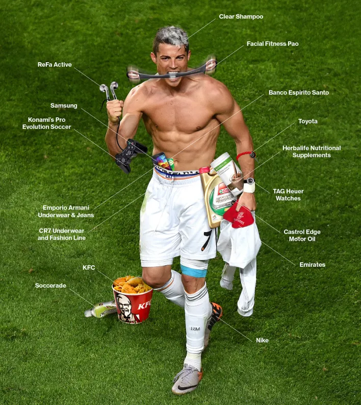 照片插图由Braulio Amado提供;摄影由Getty Images提供克里斯蒂亚诺·罗纳尔多是世界上最受欢迎的运动中最著名的球员。他看起来就像有人给一个 肯娃娃动画化,植入了埃尔维斯·普雷斯利的DNA,并给了他一个足球。这使得这位皇家马德里前锋成为最受欢迎的代言人之一。品牌希望与他的强大右脚以及偶尔的发尖联系在一起。耐克每年支付他近1000万美元,让他穿着其鞋子和服装。