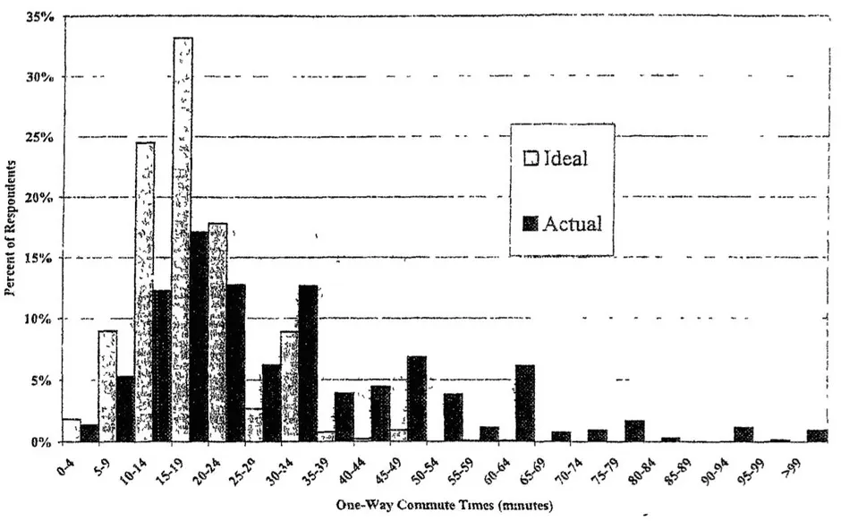 雷德蒙德与莫赫塔里安,2001年,交通现在,这只是例外,而不是规则。雷德蒙德和莫赫塔里安发现,大多数受访者,近52%,更喜欢通勤时间至少比他们的实际通勤时间短5分钟(对于这些人来说,平均通勤时间是40分钟)。但样本中有87人,或近7%,的理想通勤时间至少比他们的实际通勤时间 长5分钟(在这种情况下,平均通勤时间是10分钟)。对于42%的参与者,他们的实际和理想通勤时间大致相同,平均通勤时间是15分钟,单程。似乎15分钟是某种理想通勤常数。