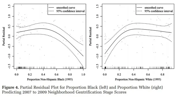 通过观察1995年准备进行重建的芝加哥邻里,黄和桑普森发现,到2000年代末,种族构成确实对一个邻里的改善和最终的绅士化机会产生了显著影响。那些看到最多改善的邻里满足了白人居民的最低比例阈值——大约35%——以及黑人居民的最高比例阈值——大约40%。