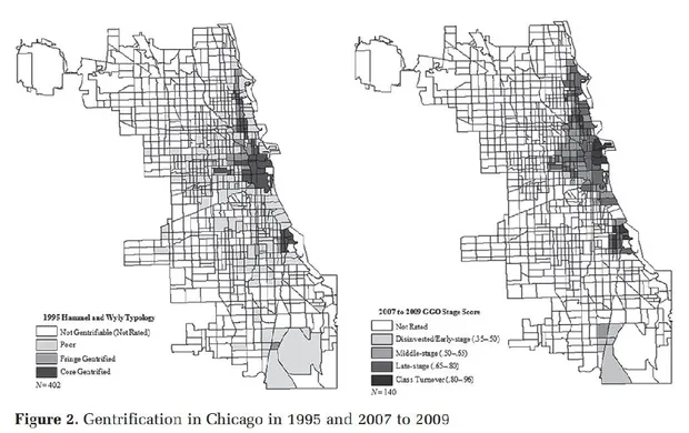 在至少40%是黑人的邻里,绅士化的机会要低得多。这项研究以芝加哥为案例,调查绅士化如何反映现有的基于种族和阶级的不平等模式。它围绕一组在1995年被认为是“可绅士化”的芝加哥邻里组织——这些邻里的中位收入低于1960年全市中位数。基于研究者丹尼尔·哈梅尔和埃尔文·怀利的工作,他们检查了99个可以与其他数据集匹配的地块子集。这包括26个在1995年被哈梅尔和怀利认为已经处于绅士化核心的地块,16个处于这一过程边缘的地块,以及另外57个黄和桑普森认为相邻且因此适合变化的地块。