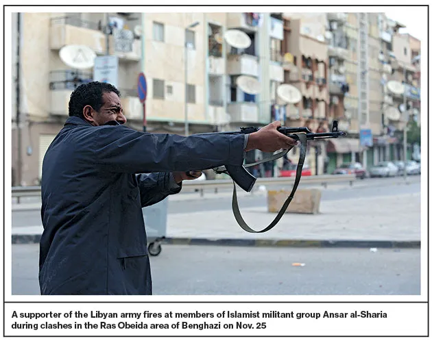 与许多政治领导人不同,利比亚前总理阿里·泽丹愿意公开讨论他对激进伊斯兰组织的恐惧,这些组织通常被利比亚人称为基地组织。虽然其中一些组织确实与基地组织有直接联系,但其他组织则与安萨尔·阿尔沙里亚及其他愿意为其激进伊斯兰意识形态而死的萨拉菲派系有关。这些组织中的一些作为更大伊斯兰民兵的先锋。“你无法与他们达成妥协,”泽丹在慕尼黑郊外一个小镇的酒店里喝咖啡时说,他现在在这里定居。“他们原则上不接受公民国家、法治国家。他们想要伊斯兰政府,或者是极端政府。”在国家崩溃留下的真空中,极端分子正在扩大他们的控制。“问题在于没有人能对抗他们,没有情报机构,没有军队,什么都没有,”他说。“所以300个极端分子可以拥有很大的权力。”