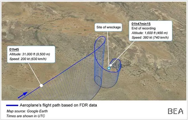 航班在起飞22分钟后达到了31,000英尺的巡航高度,并在大约两分钟后遇到颠簸,当时喷气机的速度下降,BEA表示。飞机向左转并开始迅速失去高度。它以高速坠毁在沙漠中;撞击的剧烈程度使调查人员认为飞机在撞击前是完整的。