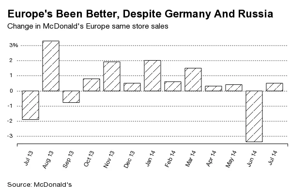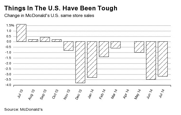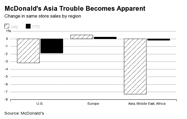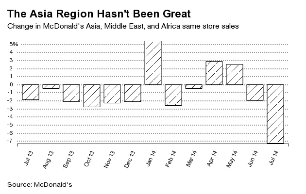 亚太、中东和非洲地区的同店销售在7月同比下降了7.3%,而麦当劳在中国的供应商上海福喜的食品安全问题在本月剩下不到两周时才被曝光。这个问题在整个8月可能会更加严重。