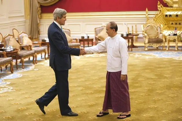 美国国务卿约翰·克里(左)在8月9日的总统府会议上与缅甸总统登盛握手照片由尼古拉斯·阿斯福里/法新社通过Getty Images提供自2012年7月以来,美国公司在缅甸(前称为缅甸)累计投资6.12亿美元。在希望在这个拥有6000万人的东南亚国家争夺市场份额的主要公司中,2011年开始政治改革的有:可口可乐、通用电气、卡特彼勒、万事达卡、西联汇款、宝洁和Gap。