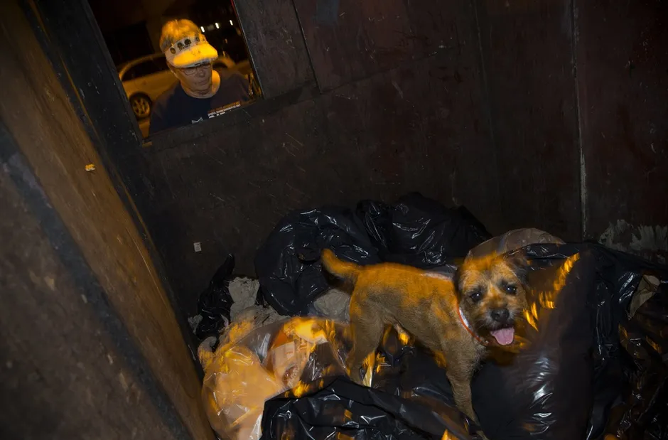 理查德·雷诺兹(左),瑞德斯小巷铲子喂养协会的创始成员,使用手电筒在垃圾箱中寻找老鼠,朱迪(右)和梅林在旁边准备捕杀。路透社/迈克·塞加尔