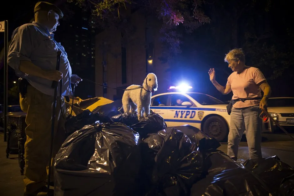 比尔带着他的狗帕科,一只费斯特梗,穿过垃圾箱附近的空地。路透社/迈克·塞加尔
