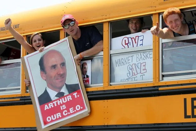 市场篮子的员工在2014年7月18日于马萨诸塞州特克斯伯里参加支持他们前首席执行官亚瑟·T·德穆拉斯的集会照片由乔安·拉斯/波士顿环球报通过盖蒂图片社提供当新英格兰最成功的零售连锁之一市场篮子的员工几周前罢工时,并不是因为管理层试图降低工资或削减养老金,或让他们为健康福利支付更多费用。而是因为他们的老板亚瑟·T·德穆拉斯被他的表亲亚瑟·S·德穆拉斯罢免了总裁职务。