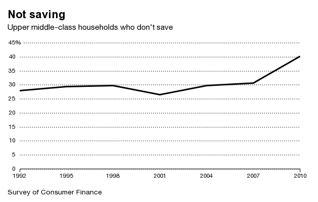 根据美联储的研究,2012年只有45%的上层中产阶级家庭(收入在75,000到99,999美元之间)有储蓄。这意味着其他55%的人没有为购房、退休或教育储蓄。大约16%的人花费超过收入,进一步陷入债务。报告强调了这些勉强维生的习惯的后果:只有一半的这些家庭有足够的储蓄来支付失业或无法工作时的三个月生活费用。一次400美元的紧急情况将迫使大约20%的人陷入数月的债务。