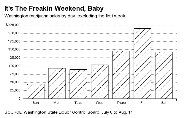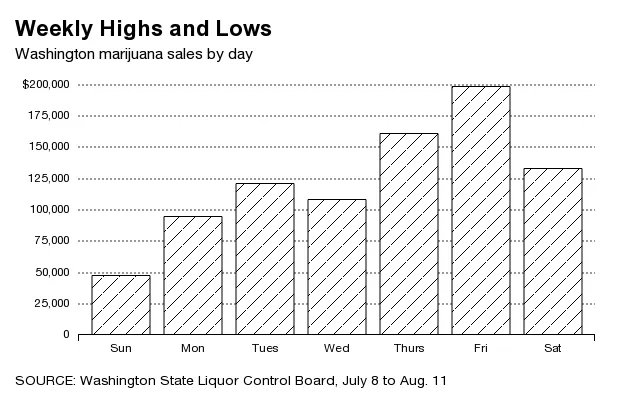 根据华盛顿州酒类控制委员会的测算,约四分之一的收入——110万美元——以消费税的形式进入州财政,尽管任何特定销售的税额在很大程度上取决于是用于医疗还是娱乐用途。正如科罗拉多州,初始销售低于预期。