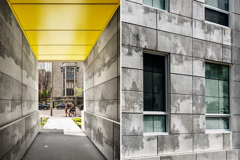解析爱迪生大楼的图形处理。KANVA大多数光刻混凝土的例子仅限于公共空间的一面墙(如魁北克市的 萨缪尔-德香普兰长廊)或外立面的一个部分(如 海德堡的古腾堡庭院)。而在爱迪生大楼中,这座三层住宅结构的整个外立面都得到了这种处理。使用历史性的本地图像具有真正令人惊讶的效果。