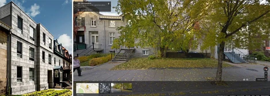 爱迪生大楼(左)取代了一个空地(右)。马克·克雷默,谷歌街景根据建筑师的说法,当人们走过时,电影静帧会时而清晰时而模糊(他们称之为“动态建筑”)。近距离观看时,外立面让你思考电影中捕捉到的城市历史。从远处看,这些图像变得更加抽象,赋予建筑一种几乎风化的外观。为了补充设计,建筑前面的窗户上印刷了电影中的静帧。