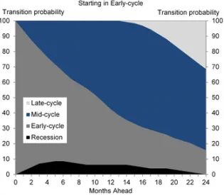 来源:高盛显示了在扩张的早期周期中经济通常会发生什么。在起始点,当“未来几个月”为零时,图表从上到下是灰色的,这意味着处于早期周期的概率为100%。在六个月内,仍然处于早期周期的概率约为70%,处于中期周期的概率为20%,处于衰退的概率约为10%,而处于晚期周期的概率接近于零。