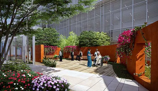 “我们基本上建造了一座倒置的医院,”项目首席设计师、NBBJ的合伙人道格·帕里斯说,该建筑公司负责该项目。“我们颠覆了通常所见的布局,不仅所有服务——供暖、制冷、水——都在四楼,而且物资和废物的运输也在上层走廊来回移动。”