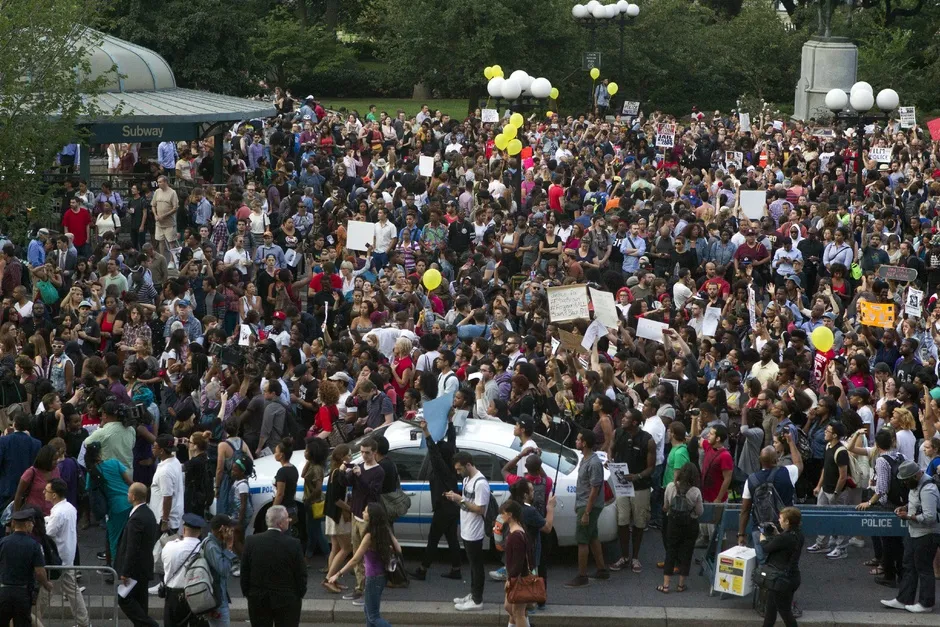 在我的城市华盛顿特区,数百名社区成员在马尔科姆·X公园集合。从那里,他们沿着NW的U街游行,这条历史悠久的黑人文化走廊如今是华盛顿市的绅士化面貌。大约有500人一起游行,举着关于密苏里州弗格森8月9日枪击事件的标语。他们经过14街与U街的交叉口,那是我见过的最大规模的自发派对的地点,正值巴拉克·奥巴马总统首次当选之夜。他们一路游行到7街,经过那家播放 go-go 音乐的手机店,声音太大,转向的不是我听说他们打算去的霍华德大学,而是城市的商业中心——中国城。