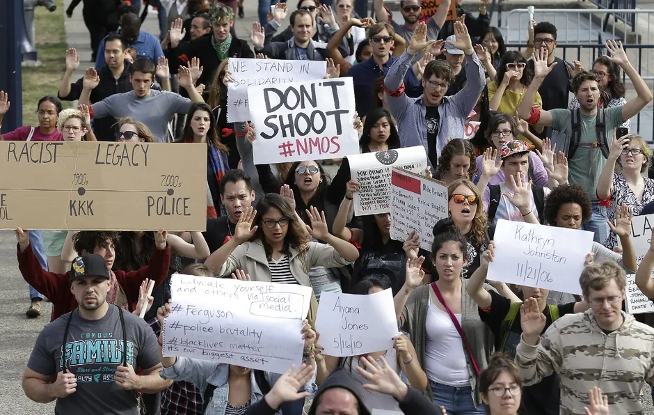 人群高喊“举手,别开枪”和其他集会口号。Jeff Chiu/AP在阿拉巴马州: