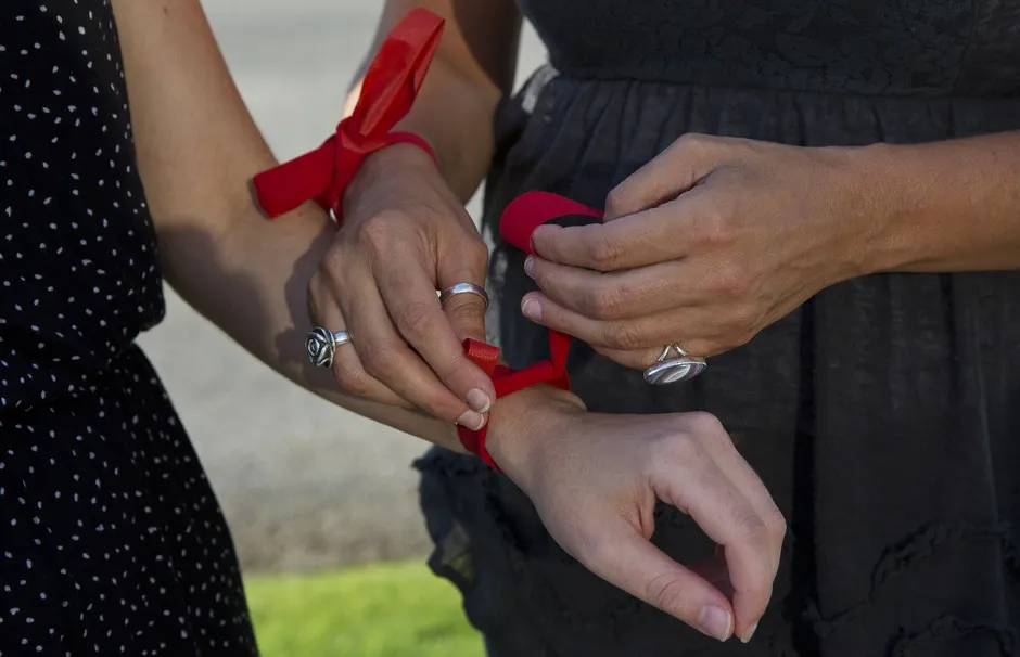 在阿拉巴马州蒙哥马利的民权纪念中心,示威者绑上红色绷带以示团结。Brynn Anderson/AP在洛杉矶: