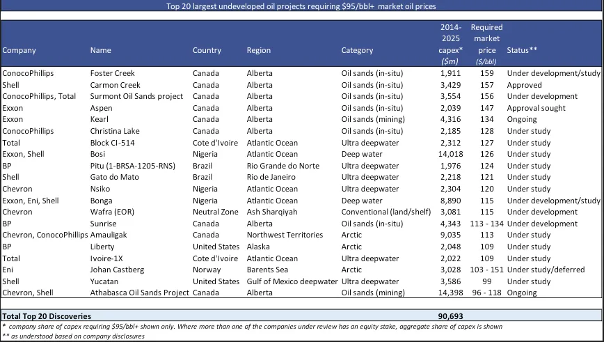 “为了创造股东价值,石油巨头需要减少对需要最高油价的勘探项目的风险敞口,而不仅仅追求生产量。为了帮助投资者,CTI列出了按规模排列的20个未开发的高成本石油项目。它们主要是阿尔伯塔油砂和大西洋深水项目的混合,代表着910亿美元的资本(在2014-2025年期间),这些资金可以返还给股东,而不是让石油公司冒险损失。”