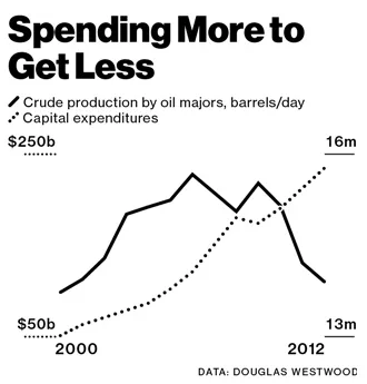 道格拉斯·韦斯特伍德 自2005年以来,大型石油公司在勘探和生产上的支出每年增加14%,却看到他们的总生产量下降。