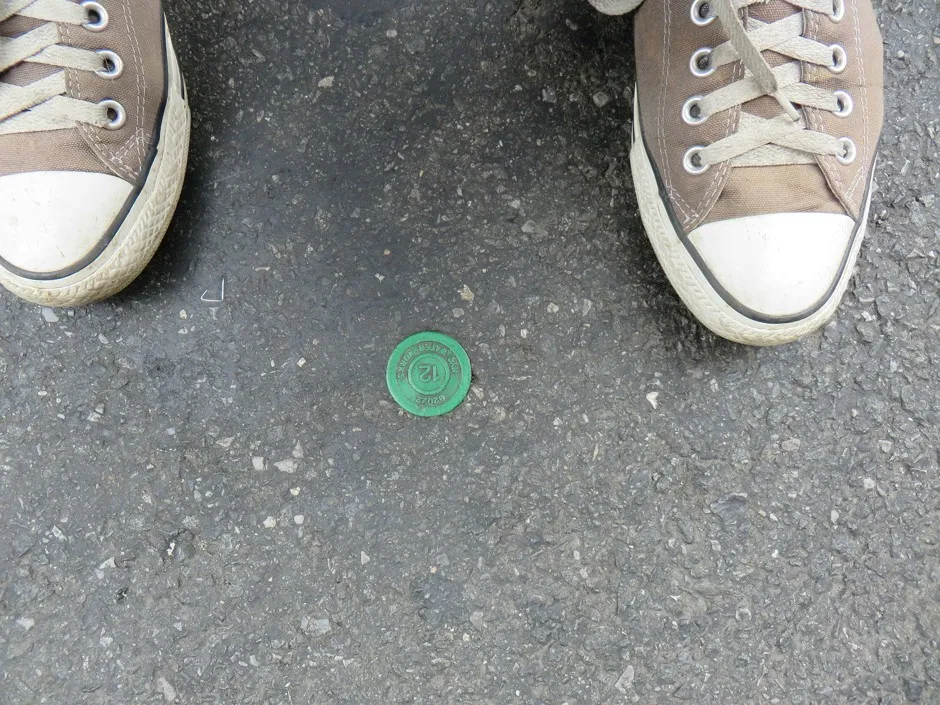在我恰好居住的纽约,这种语言包括一个特别引人注目的元素:一系列嵌入路面的圆形塑料标记,每个标记直径为一英寸半。它们以各种颜色出现,并印有一堆字和数字,给人一种波普艺术的感觉,有点像扑克筹码。一旦你开始注意到它们,就无法停止——它们几乎出现在每一个街区。乍一看,它们似乎是随机分布的,但仔细观察后会发现,它们只出现在沥青补丁上——那些被公用事业或承包商挖掘后重新铺设的路面。