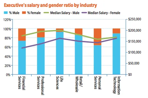 根据TriNet的数据,企业高层也存在类似的趋势。包括副总裁和首席执行官在内的职位薪资范围在科技和个人服务行业中最小,这两个行业男性高管的薪资最低。在金融和专业服务行业,薪资差距更大,男性的中位数薪资更高。