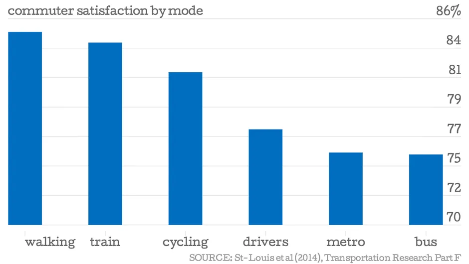 这些是基本情况。但深入细节,研究人员发现了一些显著的差异。其中一个,不出所料,是旅行时间在两个层次之间的差异中占据了很大一部分。无论是哪种方式,较长的旅行时间都会导致较低的满意度,但步行者、火车乘客和骑自行车的人受时间变量的影响最小——这无疑是因为他们享受通勤本身,而不是将其视为达到目的的手段。司机和公交乘客的满意度也因额外的“预算”旅行时间而受到影响,这可能是由于不可预测的交通造成的。
