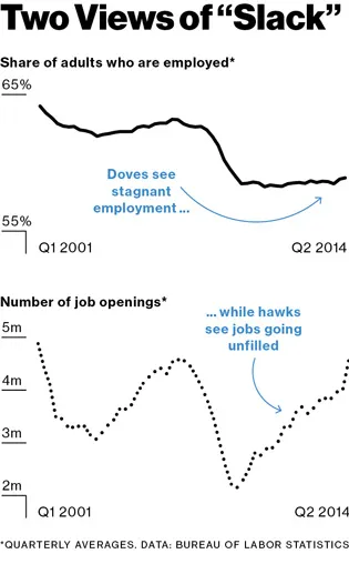 但耶伦不能理所当然地认为会得到支持。费城的普洛斯在7月30日的声明中表示异议,理由是关于利率将保持低位的语言“并未反映出在委员会目标方面取得的相当经济进展。”8月20日发布的会议记录显示,其他联邦公开市场委员会成员对这一观点表示了一些同情。除了普洛斯,鹰派还包括里士满、圣路易斯和达拉斯的美联储行长。(并不是所有地区行长在任何给定年份都投票,但所有人都参与联邦公开市场委员会的讨论。)鹰派关注未填补职位数量的急剧增加,询问如果在6月底有470万个职位空缺,劳动力市场究竟还有多少闲置空间。这一数字比2009年7月的210万低点有所上升。他们担心,许多退出劳动力市场的人将永远不会回来——因为他们提前退休或领取残疾补助,或者他们的技能退化。下降的失业率可能很快从好事变成坏事,他们暗示。在最近的一次演讲中,达拉斯联邦储备银行行长理查德·费舍尔表示,“经济正比我们想象的更快地达到我们期望的目标。”