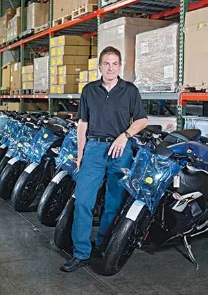 埃里克·布埃尔摄影:格雷格·鲁芬为《彭博商业周刊》拍摄埃里克·布埃尔赛车公司的工人们在过去一年里为喜欢快速移动的富人制造摩托车。EBR最新型号1190SX于7月上市,售价为16,995美元,是“想在赛道上以110英里每小时速度行驶的人”的不错选择,纽约马尔伯勒的摩托车经销商Big Boyz Toys的共同所有者安东尼·加林贝尔蒂说。尽管该公司以制造强大的奖杯摩托车而闻名,但EBR的150名工人中有三分之二大部分时间都在设计非常不同的车辆:为印度大众市场制造廉价摩托车和踏板车,在那里,低价格和耐用性胜过马力和性感吸引力。