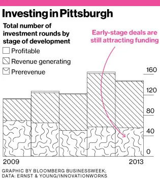 有一些迹象表明企业家们正在放弃。在匹兹堡,风险投资在2013年降至1.3亿美元,比2006年谷歌到达后的高峰2.2436亿美元下降了42%,根据The MoneyTree Report,这是对美国风险投资的季度研究。在同一时期,全国其他地方的风险投资交易增长了7%,达到了296亿美元。“初创公司?他们必须竞争,”鲁索说。她表示,匹兹堡的大公司和小公司越成功,人才库和收入就会越增长。