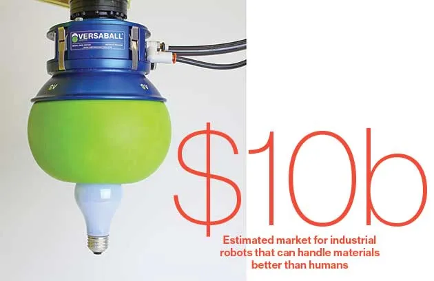 在九月份,这家成立两年的波士顿初创公司帝国机器人计划开始发货Versaball Gripper,这是一种用于钢制机器人手臂的软抓取附件。Versaball是在康奈尔大学和芝加哥大学开发的,资金来自达尔帕。帝国的这种像豆袋一样的机器人手臂附件由一个气球状的颗粒物质袋组成,可以根据手臂试图抓取的物体的形状进行轮廓调整,并且能够紧握而不至于压碎。物理学家称之为“堵塞转变”;想象一下真空包装的咖啡袋,在你撕开密封之前,它们保持坚硬如石。帝国的研究与开发主任纳迪亚·程说,这个附件“非常简单,甚至没有任何电子组件”,她还在将这个抓手测试作为假肢手。过去一年,帝国获得了约200万美元的私人天使投资和国家科学基金会的小企业补助。