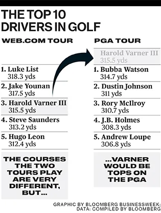 自从两年前从北卡罗来纳州格林维尔的东卡罗来纳大学毕业以来,刚满24岁的瓦尔纳一直在努力争取在PGA巡回赛上占有一席之地。他在堪萨斯参加中西部经典赛,这是Web.com巡回赛的一个站点,Web.com巡回赛是PGA巡回赛的下一级,也是大多数职业球员进入PGA的唯一途径。在比赛的156名选手中,瓦尔纳因其长打而脱颖而出。身高5英尺9英寸的他产生了紧凑而有力的挥杆,平均开球距离超过315码,排名巡回赛第三。“我打得真的很远,真的很远,”他说,理所当然地说道。