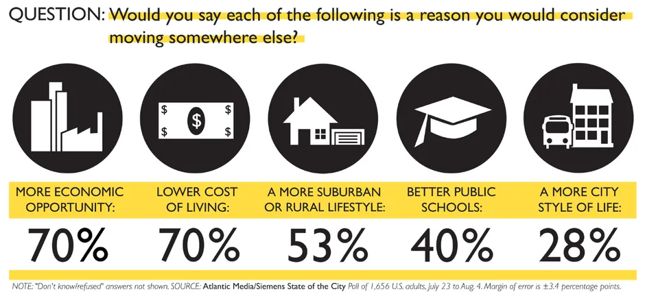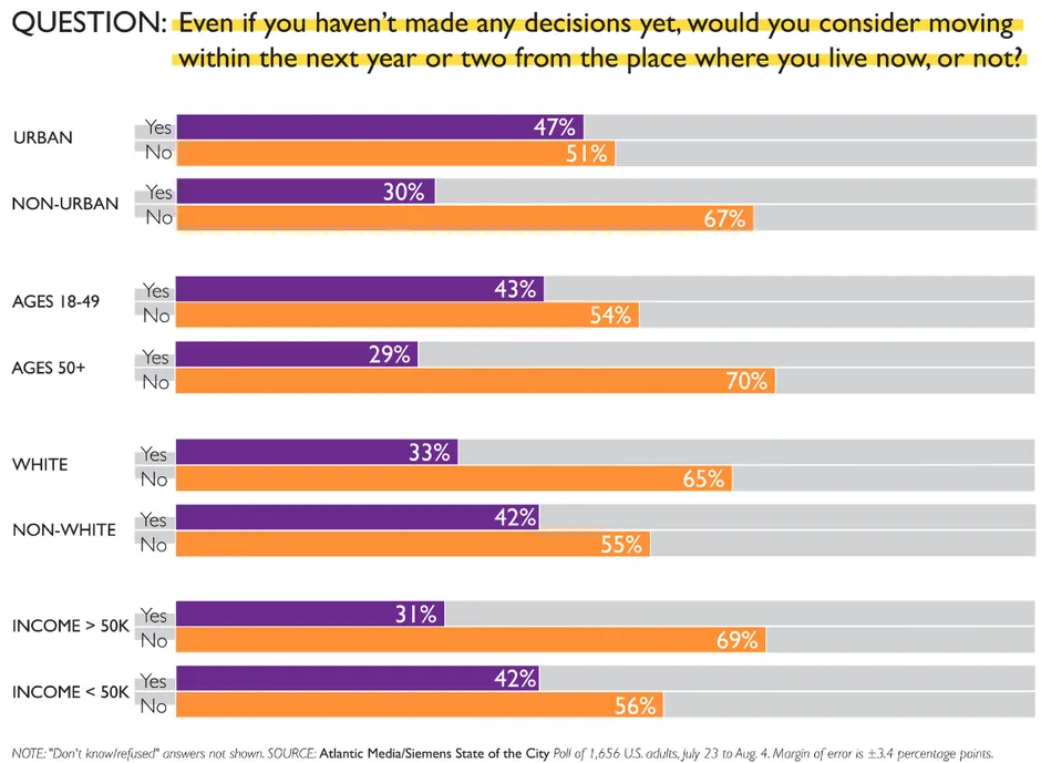 这并不是说民众之间没有根植感。约三分之二的受访者表示,他们对自己目前的居住地感到满意,愿意长期居住。但在城市中,渴望流动的情绪正在涌动:47%的受访美国城市居民表示,他们愿意在未来一两年内搬家,而非城市居民中这一比例仅为30%。