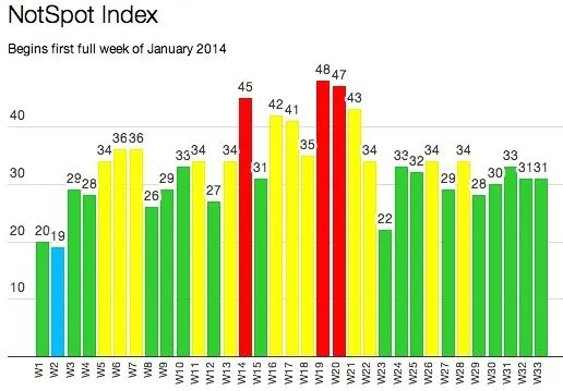 Citi Bike——根据Wald的说法,与康奈尔大学的计算机科学家 David Shmoys 合作——最近在平衡方面做得更好。 bikeshareNYC 博客保持着一个NotSpot指数,跟踪有多少Citi Bike站点是空的或满的。在最近几周,Citi Bike一直处于重平衡的“绿色”区域,这意味着在调查时只有20到33个站点不可用。以下是最新的指数: