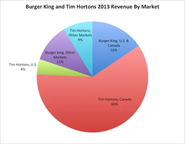一些人可能会想,最大市场是指什么?查看这两家公司的2013年数据,这并不是基于地点——那样的话,美国将是其最大市场。这两家连锁店合计将拥有超过18,000家门店(大约4,500家蒂姆·霍顿斯和13,800家汉堡王),其中44%位于美国,21%位于加拿大,35%位于其他国家。答案实际上在于美元。
