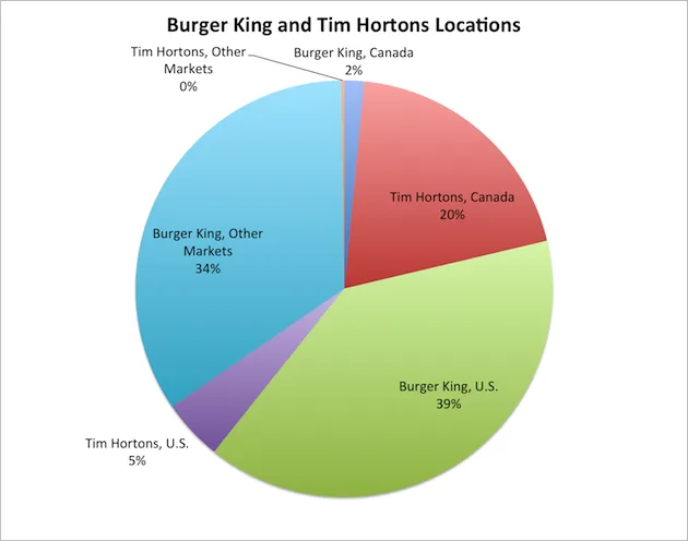 一些人可能会想,最大市场是指什么?查看这两家公司的2013年数据,这并不是基于地点——那样的话,美国将是其最大市场。这两家连锁店合计将拥有超过18,000家门店(大约4,500家蒂姆·霍顿斯和13,800家汉堡王),其中44%位于美国,21%位于加拿大,35%位于其他国家。答案实际上在于美元。