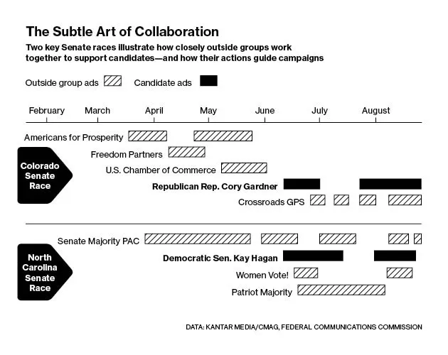 在北卡罗来纳州5月的共和党初选前,美国交叉路口和商会达成协议,分担五周的参议院竞选广告,支持州立法者汤姆·蒂利斯,他正在抵御茶党挑战。交叉路口为前四周支付了160万美元。这些广告下线的当天,商会以90万美元的价格在同一市场投放了一周的广告,根据Kantar Media的CMAG数据,该机构跟踪竞选广告支出。蒂利斯赢得了决定性的胜利,避免了昂贵的决选。“这是联合民调,联合沟通,”美国交叉路口和交叉路口GPS的政治主任卡尔·福尔蒂说。