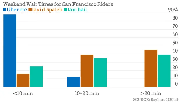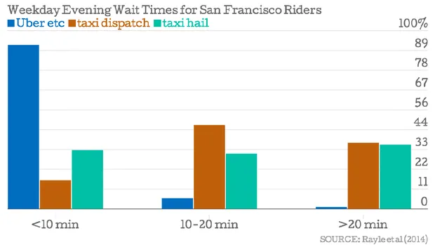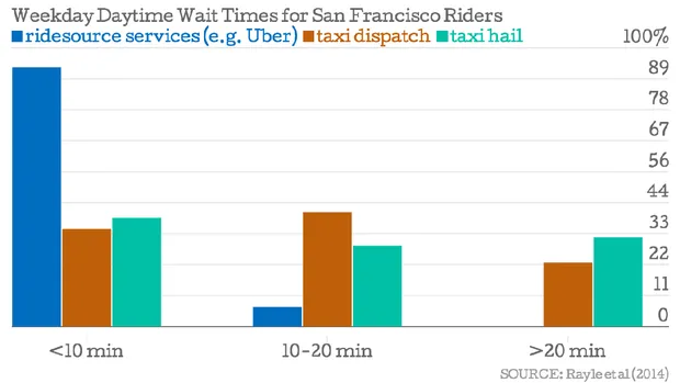 这在很大程度上与出租车为城市提供的服务相符。但在等待时间方面, ridesourcing 和出租车体验之间存在明显区别。根据这项新研究,Uber 等在这里占据了巨大的优势。我们在下面绘制了一些关于等待时间的数据。