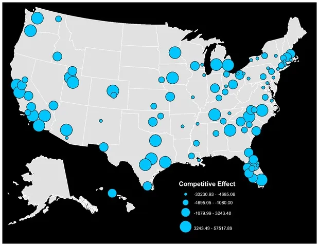 一些竞争效应最小的城市让人惊讶,包括华盛顿特区和纽约,以及像圣路易斯、匹兹堡、克利夫兰和布法罗这样的铁锈带城市,还有芝加哥和费城。