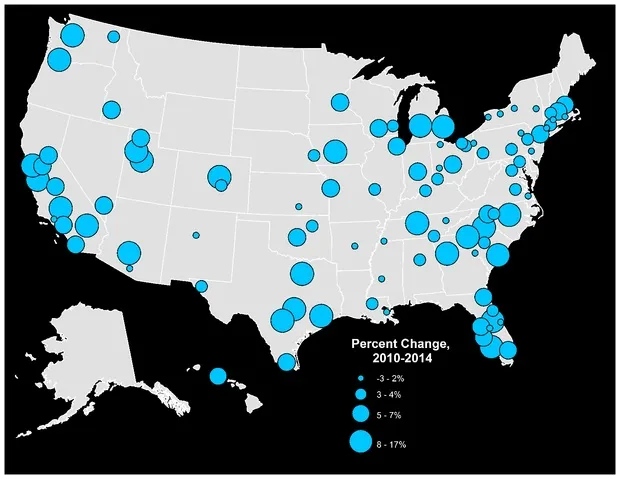 第一张地图显示了获得(和失去)最多需要高等教育的工作的城市,绘制了2010年和2014年此类工作的百分比变化**。**有10个城市的大学毕业生工作增长超过10%,另有39个城市的此类工作增长5%到10%,以及26个城市增长3%到5%。八个城市没有增长或下降。