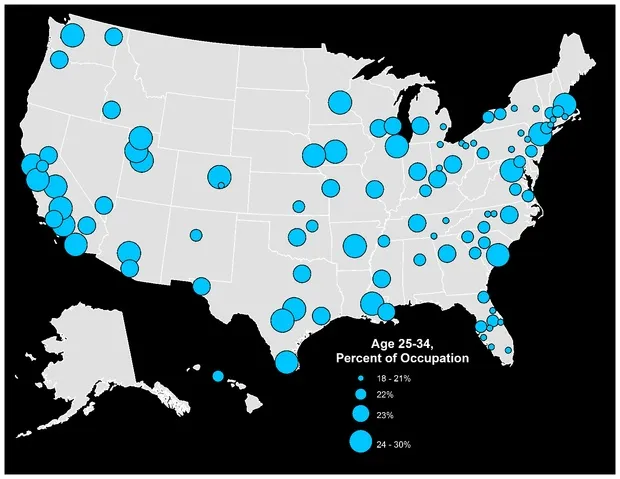 另一方面,有些大都市中,25-34岁的人群在需要高等教育的工作中所占比例不到五分之一。这些包括俄亥俄州的铁锈带大都市,如扬斯敦(18%)和阿伦敦(20%);宾夕法尼亚州的斯克兰顿(19%);以及纽约的锡拉丘兹(20%),还有佛罗里达州的阳光带退休胜地,包括棕榈湾(18%)、北港(19%)和代托纳海滩(18%)。