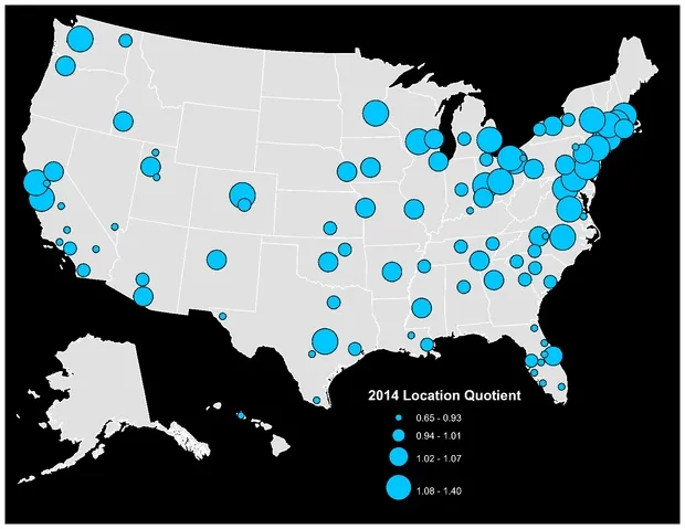 第四张地图根据其位置商数(LQ)绘制了需要高等教育的工作的相对集中度。LQ为1.0意味着该大都市与全国平均水平相当,而LQ低于1.0则表示低于全国平均水平,LQ高于1.0则反映高于全国平均水平。