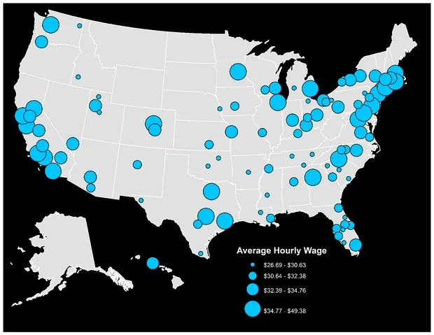 圣荷西以每小时49美元位居榜首,其次是华盛顿特区(46美元)、旧金山(45美元)、康涅狄格州的布里奇波特(44美元)、纽约(44美元)和波士顿(41美元)。