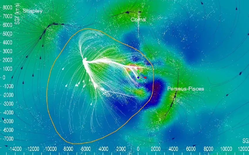 拉尼凯亚超星系团。由法国CEA/Saclay的DP开发的SDvision互动可视化软件上面是该地图的一部分。它显示了拉尼凯亚的一部分,位于“超星系赤道平面”内——一个不仅显示我们超星系团,还显示附近其他超星系团的虚构平面。白色线条显示拉尼凯亚的引力如何将星系团拉向它,而深蓝色流线则表示远离拉尼凯亚的引力。橙色圆圈包围了这些引力流的外部边界,有效地绘制了我们超星系团的周边。他们的发现 指出该区域的质量约为1017个太阳:一千亿亿个太阳。