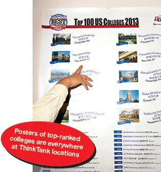 马全方位地关注孩子。除了辅导和考试准备,ThinkTank还雇佣了大约30名大学招生顾问,帮助高中生注册社区大学的高级课程,协助他们寻找实习和志愿者团体,甚至支持那些努力让孩子远离视频游戏的父母。到了高年级,顾问们会集思广益,编辑论文,以“战略性地定位”学生的声音和简历。他们还会校对申请材料,他说。“一个好的雕塑家能展现出石头的自然美,”马说。 ThinkTank位于米尔布雷的中心靠近旧金山机场,位于一个商业街区,那里还有一家灵媒和第9号足疗店。里面,学生的照片排列在接待区。每个框架下方印有孩子的名字、SAT分数和她进入的前10所大学。常春藤联盟的旗帜和展示ThinkTank招生结果的从地板到天花板的海报装饰着走廊。马丁·路德·金的“我有一个梦想”演讲就在附近悬挂着。