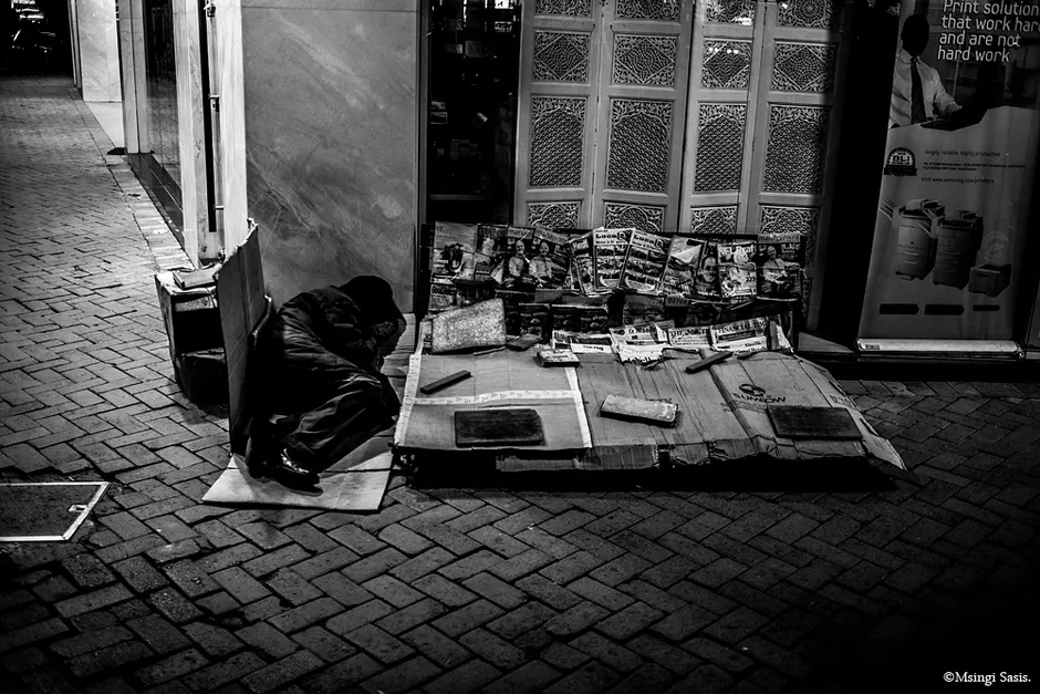 中央商务区是Sasis大多数照片的背景,但夜晚的各种占用者则是主题。关心的商家、薪水微薄的保安、无家可归者和年轻的路人都扮演着独特的角色。“内罗毕黑色主要是关于人,”他说。中央商务区持久的人文主义将超越其逃离的商业。