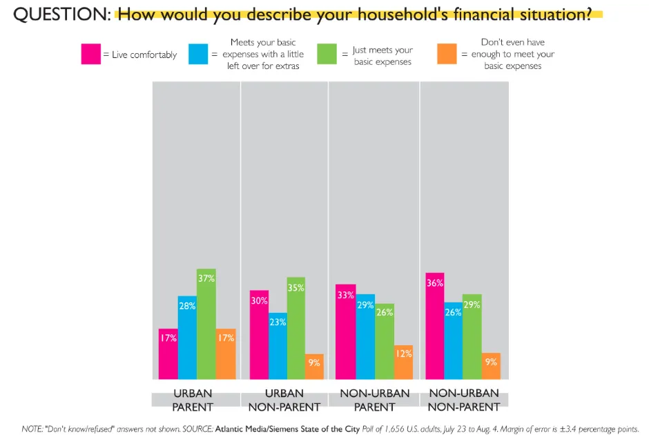 根据大西洋媒体/西门子城市状况调查,在美国城市中抚养18岁以下孩子的父母感到经济压力最大。我们调查中有54%的城市父母表示他们仅能勉强维持基本开支,甚至没有足够的资金来覆盖基本费用。这与38%的非城市父母的说法形成对比。尽管许多没有孩子的城市居民(44%)也表示他们在履行财务义务方面感到困难,但城市父母似乎面临着最大的挑战:超过六分之一(17%)表示他们没有足够的资金来满足基本开支。
